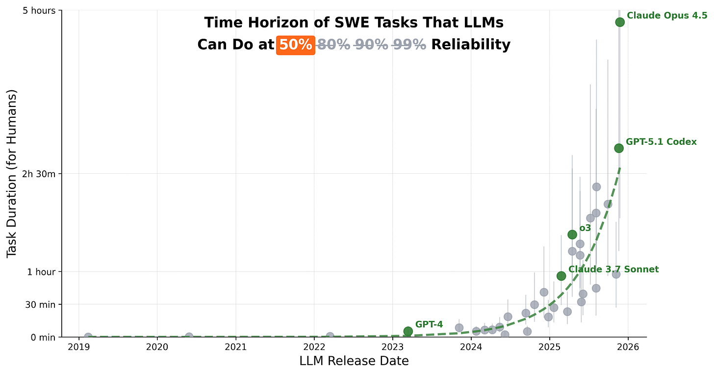 We talk breathlessly about AI’s ability to handle exponentially longer tasks. “Look, it can do 5-hour METR tasks!” (Opus 4.5 METR results came out over the weekend.) But, if you read the fine print, METR shows median success by default. What happens when you need >50% reliability?