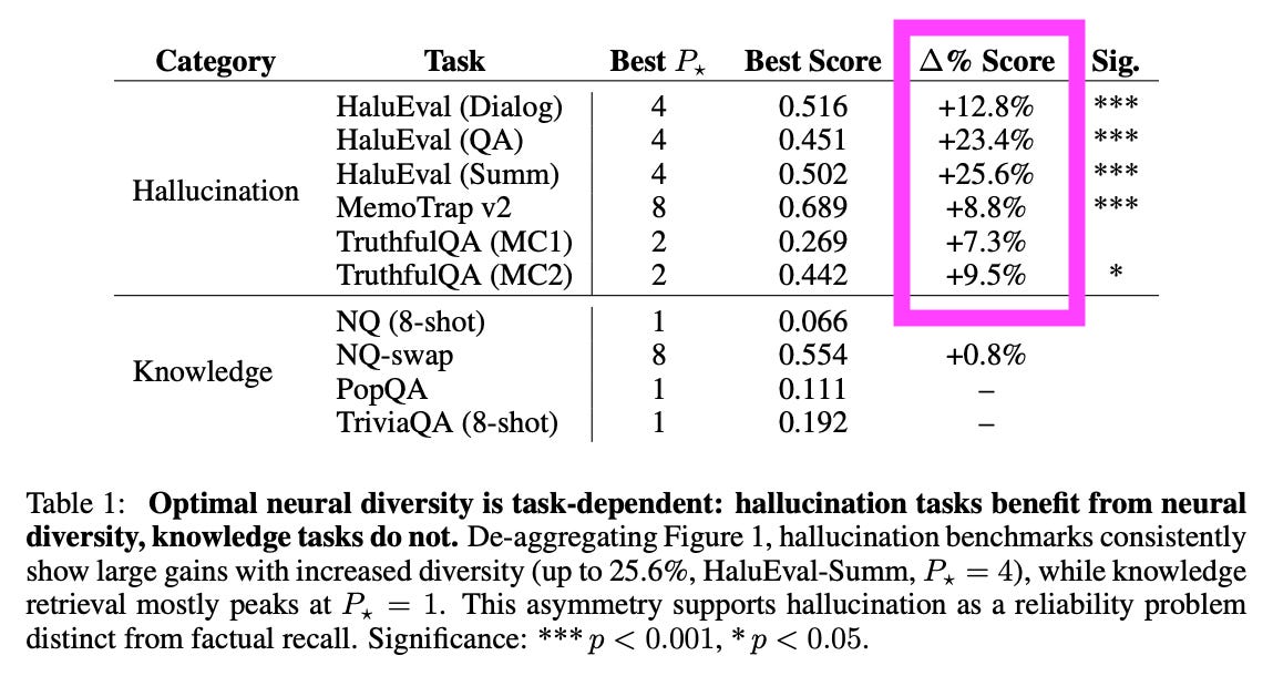 We took a different angle. You can use a 70-year-old (Nobel Prize-winning) theory to reduce hallucinations by ≥25% at just +0.004% additional pretraining, if you’re simply willing to re-think the typical framing of hallucinations. And the math isn’t just elegant, it’s empirically tight: our theoretical framework explains 94% of observed reliability variation across configurations. All in, it suggests a third scaling axis beyond parameters and data for reliability: not “how big?” (parameters) or “how much?” (data) but “how different?” (neural diversity).