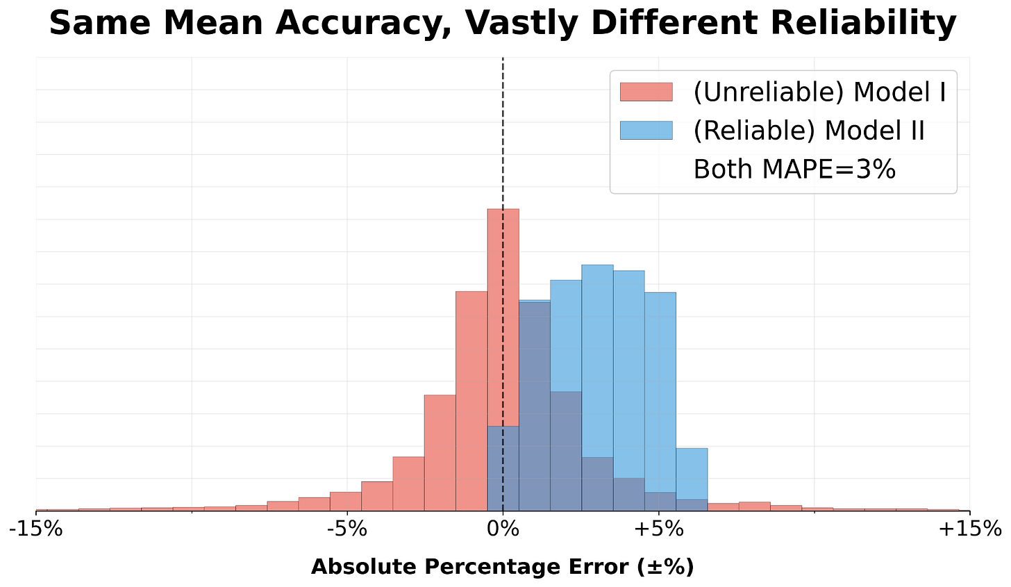 Consider two AI pricing models, both with 3% MAPE (mean absolute percentage error):